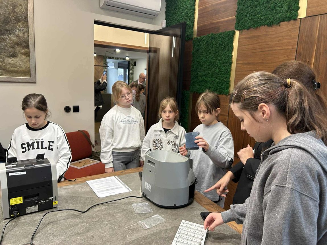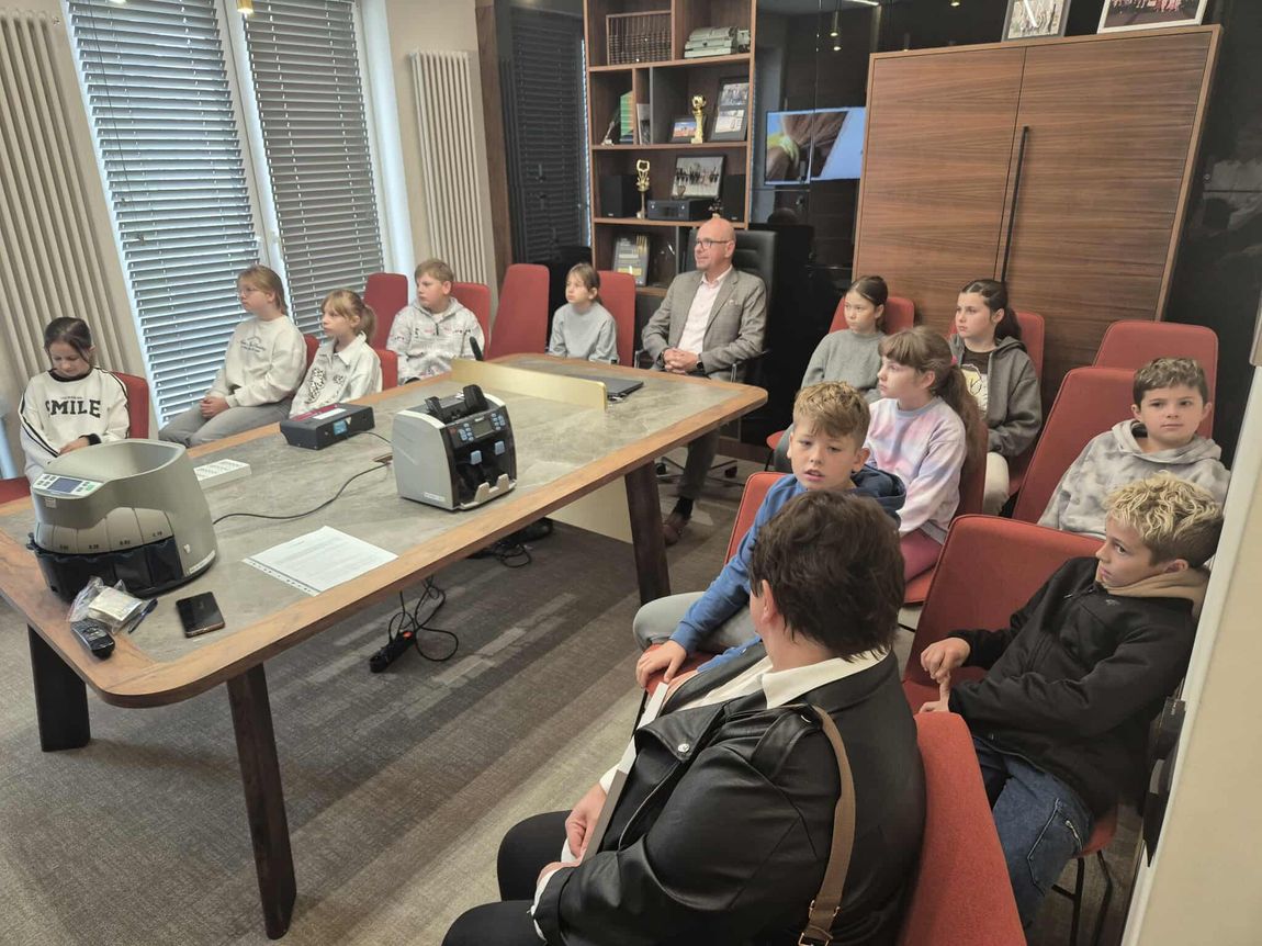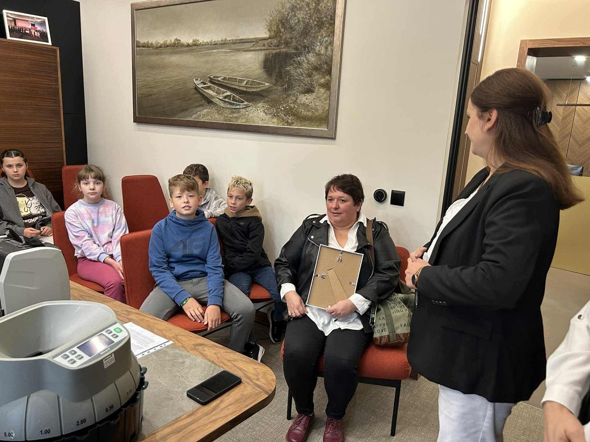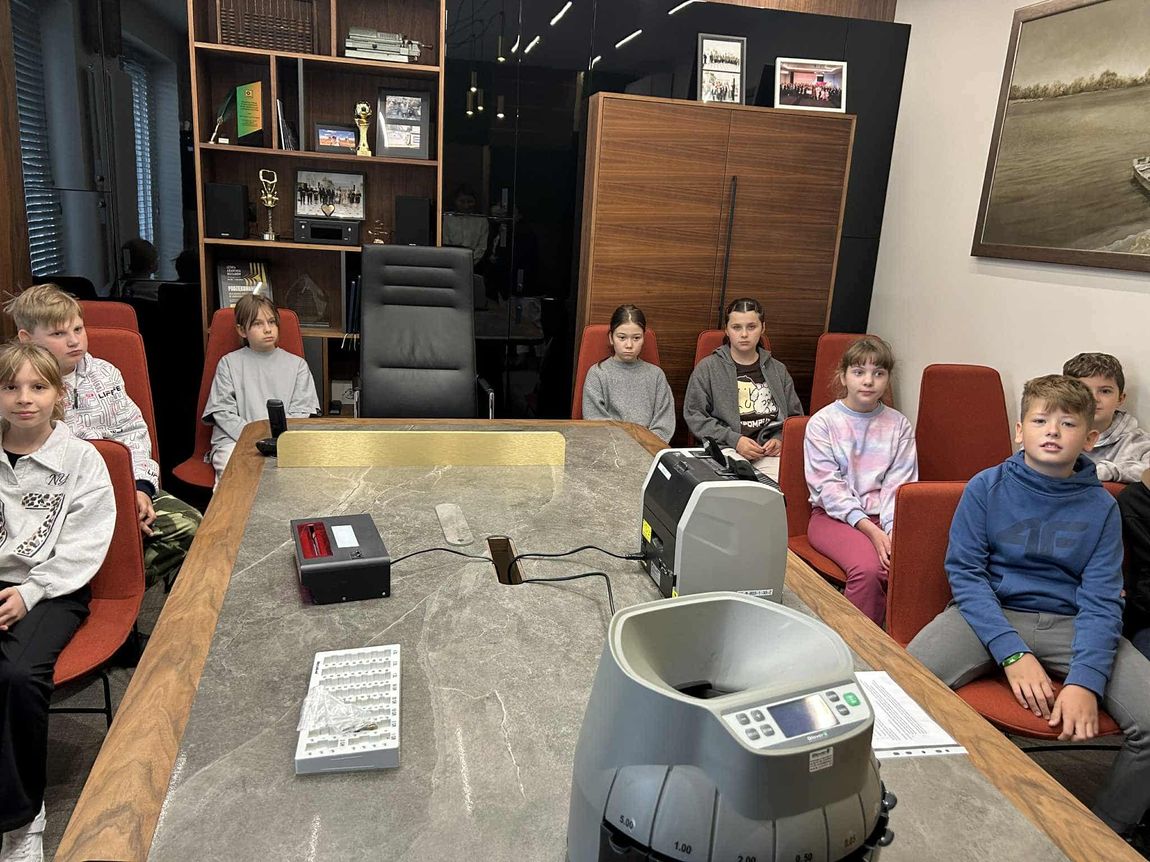 Podczas wizyty dzieci miały okazję spotkać zarząd i pracowników placówki, poznać zasady działania instytucji finansowej oraz dowiedzieć się, czym jest konto bankowe, karta płatnicza i oszczędzanie. Pracownicy banku w ciekawy sposób opowiadali o swojej pracy, a uczniowie z zainteresowaniem zadawali pytania, m.in. o bankomat i kasę. Najwięcej emocji wzbudziła możliwość obejrzenia zaplecza banku i różnorodnych urządzeń ułatwiających pracę kasjera, t.j. liczarki banknotów i monet, testera banknotów UV oraz niszczarki. Nie mniej wrażeń dostarczyła czwartakom możliwość „przymierzenia się” do fotela prezesa.